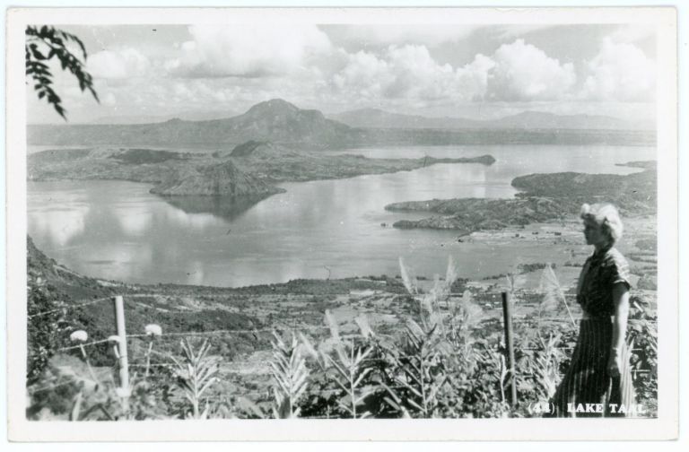 Blond Caucasian woman stands by a fence on the edge of the caldera of Taal Volcanto, with Taal Lake and Volcano Island seen in the distance.