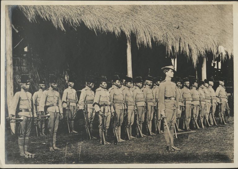 Subject: A group of constables formed from indigenous Filipino men stand at attention behind an American officer. The Philippine Constabulary was a military-type police force of the Philippines establ
