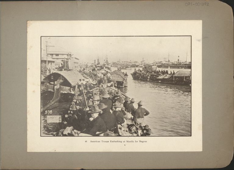 Subject: U.S. soldiers loaded onto cascos (freight barges) in the Pasig River for loading onto an inter-island steamer in Manila Bay. Givens was the post photographer at t