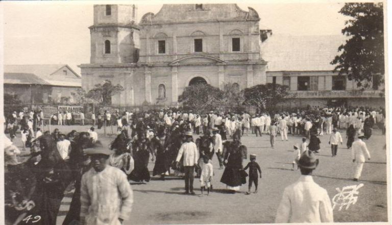 Subject: Crowd gathers in a plaza outside a unidentified church. The people are well-dressed, so this may be for a religious holiday, a celebration, or fiesta. A commerically-sold photograph, numbered