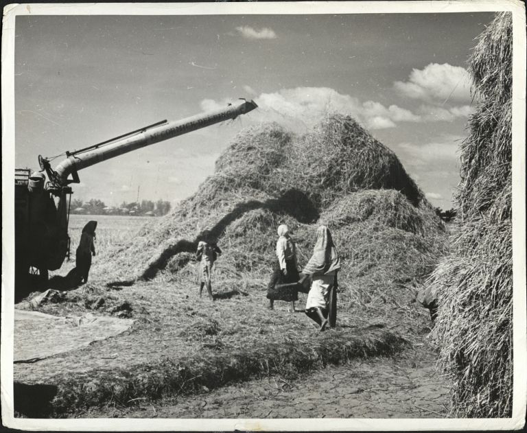 Subject: Filipino farm workers harvest rice with the aid of a combine. Full caption continues: "Both men and women workers in the fields always wear either bamboo hats or cotton shawls for protection