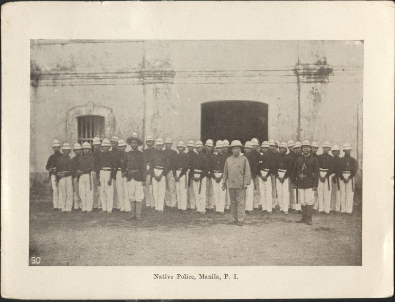 Subject: Group of policemen in white hats and trousers pose with their leaders for a portrait outside a building. Givens was the post photographer at the Presidio of San Francisco starting
