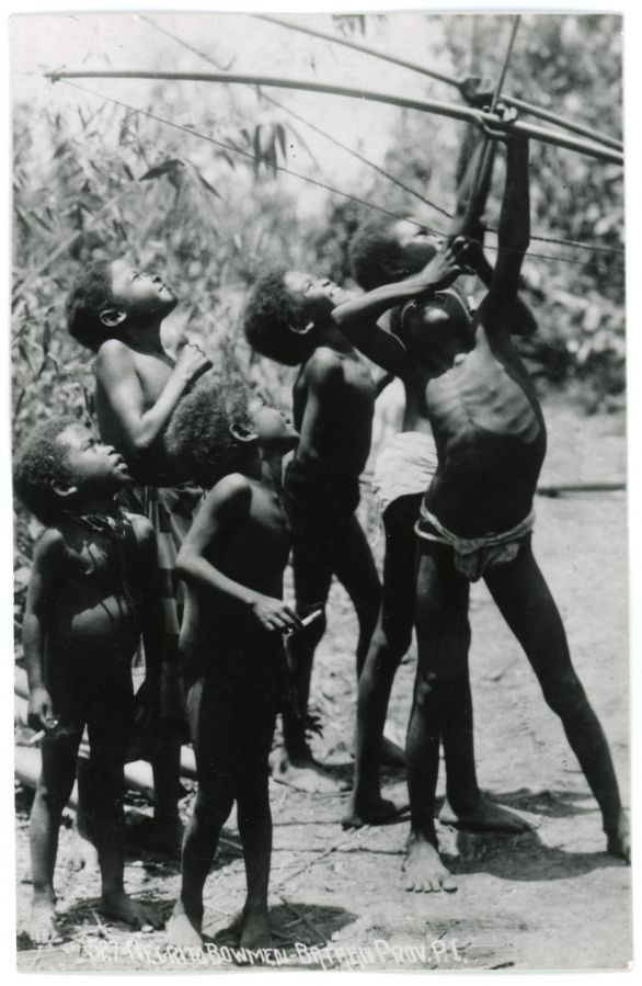 Group of Aeta boys shooting arrows into the sky. While the Aetas are highly skilled in the use of the spear and the bow and arrow, they use it mainly for hunting games and rarely for warfare.