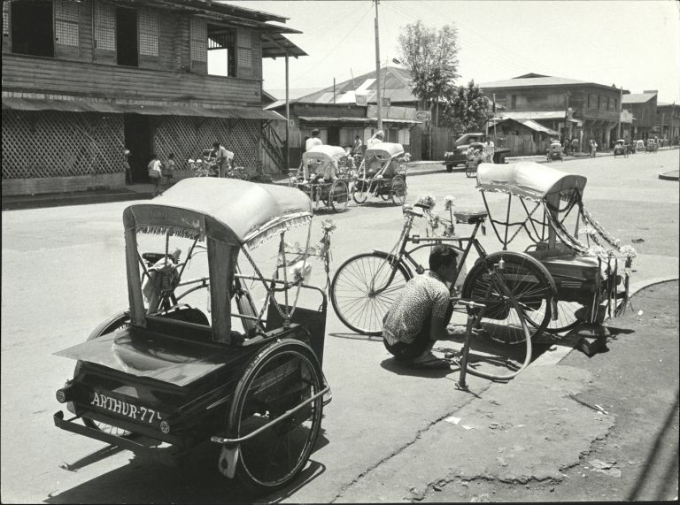Subject: A familiar sight to all Filipinos, tricycles today are motorcycle-powered, but they serve the same function: cheap local public transportation. Here a man in Jolo pumps up the tires on his pe