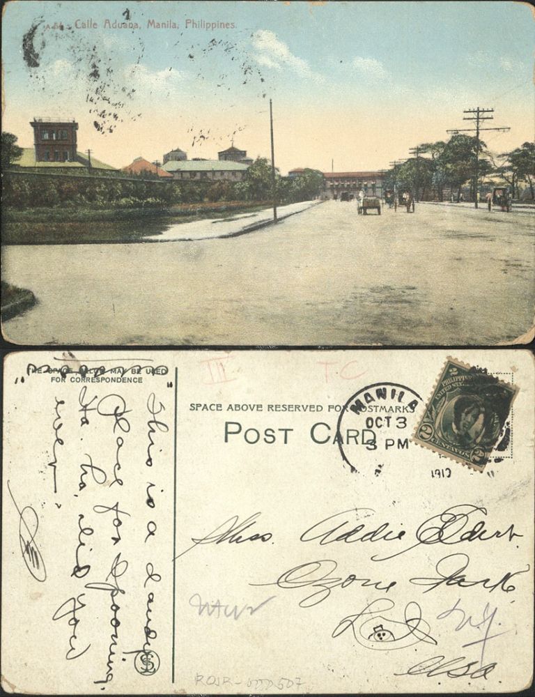 Subject: Wide intersection of Calle Aduana (aka A. Soriano Ave.) in Intramuros with calesa, cart, and buildings.