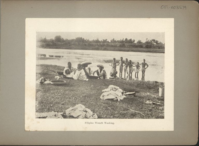 Subject: Filipino women wash clothes in basins on a riverbank while children pose in the river. Givens was the post photographer at the Presidio of San Francisco starting