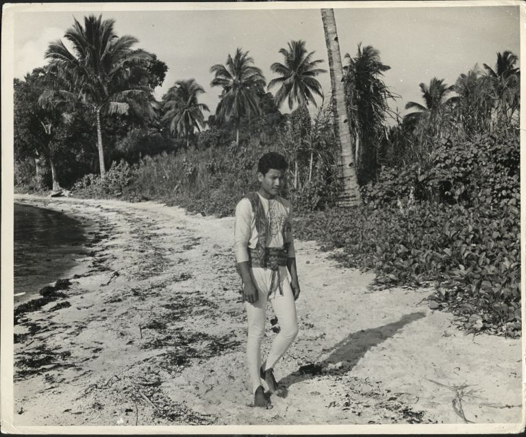 Subject: A Muslim man in traditional dress walks along a beach on Jolo Island.
