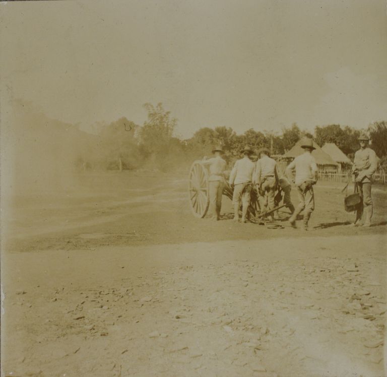 Subject: U.S. soldiers fire cannon in the open (not behind a defensive barrier) during a battle around Imus, Cavite in November, 1899.