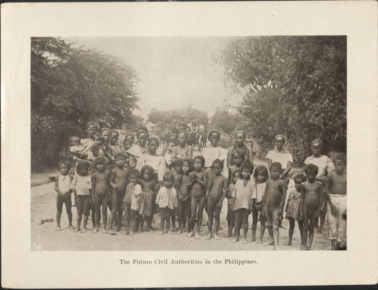 Subject: Large group of Filipino women and children (same naked) stand in a road with men on horses and carts (U.S. soldiers?) in the distance. The condescending caption reflected some Ame