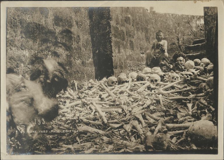 Subject: Boy holding skull amid bone pile in Paco Cemetery (now Paco Park), Manila. Burial vaults were typicallly leased and re-used. See also ROJR-000341 for a postcard version of this same image.
