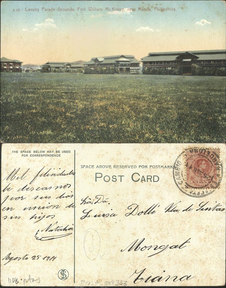 Subject: Parade field with buildings and barracks of Fort William McKinley (later Fort Bonifacio) beyond.