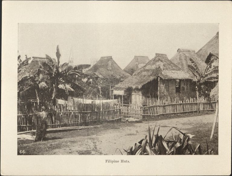 Subject: Nipa huts along a road in a Philippine village, neatly fenced in with bamboo poles. Givens was the post photographer at the Presidio of San Francisco starting in 1899. In 1900 he