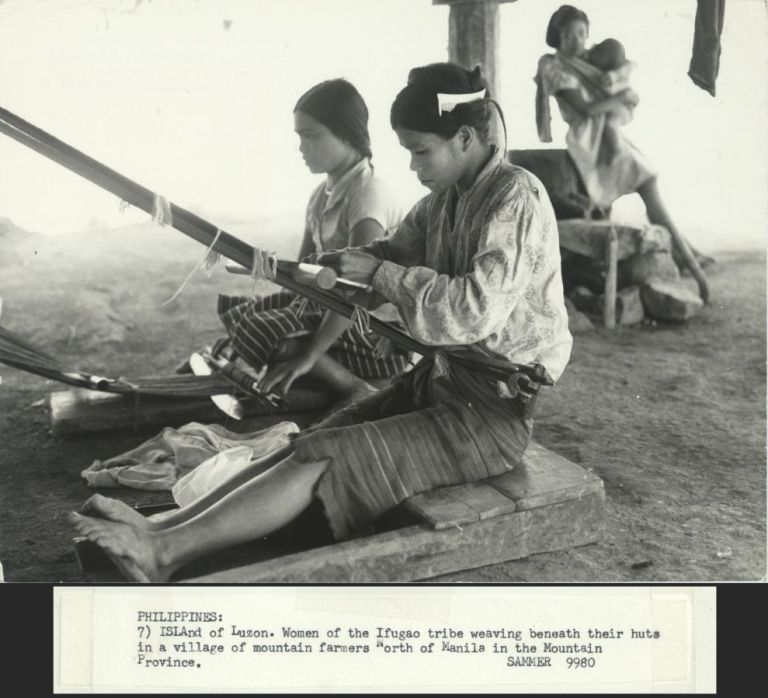 7. PHILIPPINES: Island of Luzon. Women of the Ifugao tribe weaving beneath their huts in a village of mountain farmers north of Manila in the Mountain Province. Sammer 9980.