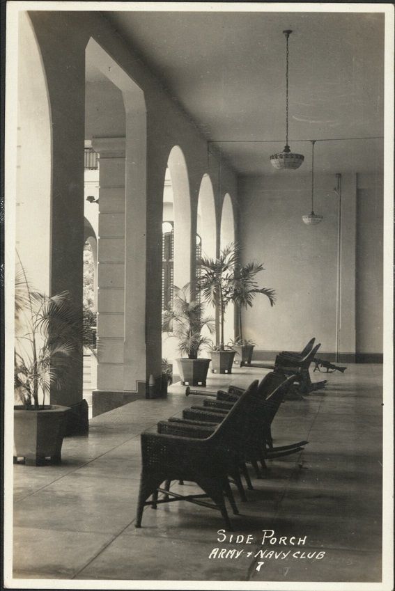 Subject: An open-air covered porch at Manila's Army & Navy Club. Founded in 1898, this building was opened in 1911, originally a social club for U.S. Army and Navy officers, service nurses, and