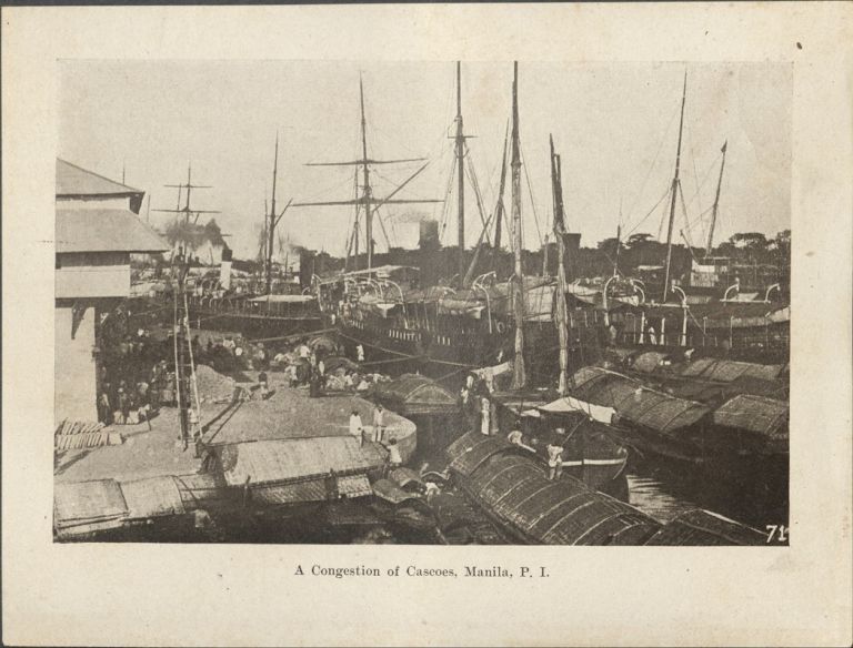 Subject: Cascos (freight barges), steamships, and sailing ships line a wharf on the Pasig River. Givens was the post photographer at the Presidio of San Francisco starting