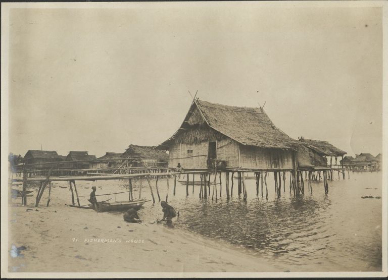 Subject: Houses in a seaside fishing village are built on wooden pilings over the water.