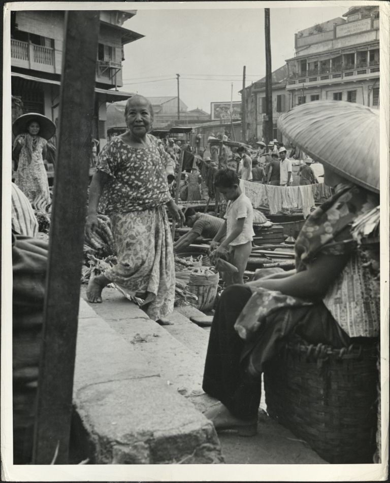 Subject: Old Filipino woman stands on steps before a market in Manila. Full caption continues: "Notice the huge helmets made of nipa palm, the washing in the streets, the fruits and vegetables for sal
