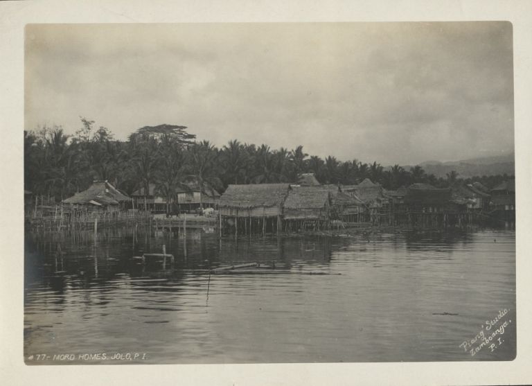 Subject: A commercial photo of the homes of Filipino Muslims in a fishing village in Jolo on the Sulu Archipelago.