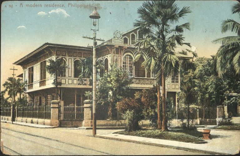 Subject: Very large, ornate 2-story house on fenced corner lot in Manila, across the street from a park or plaza.