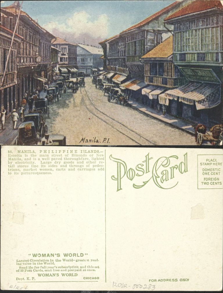 Subject: Calesas lining both sides of Escolta Street in Manila. Full caption: "The Escolta is the main street of Binondo or New Manila, and is a well-paved thoroughfare, lighted by electricity. Large