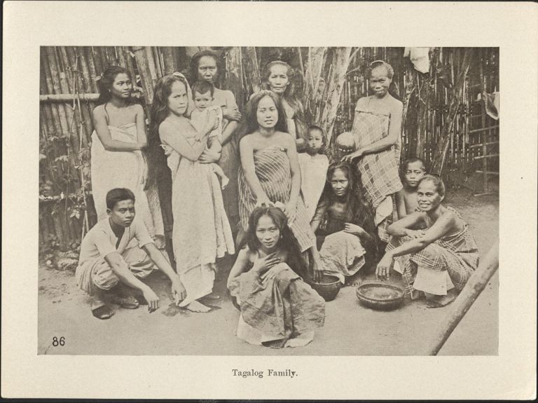 Subject: Smiling group of Filipino women and one man pose before a bamboo fence, some are doing household chores or cooking. See also OFI-003530, same image differently captioned. Givens
