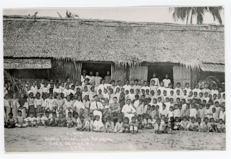 Group portrait of schoolchildren, teachers, and nipa-roofed schoolhouse in San Policarpo, Eastern Samar. Originally a barrio of the municipality of Oras, Samar, San Policarpo became a town in 1837.