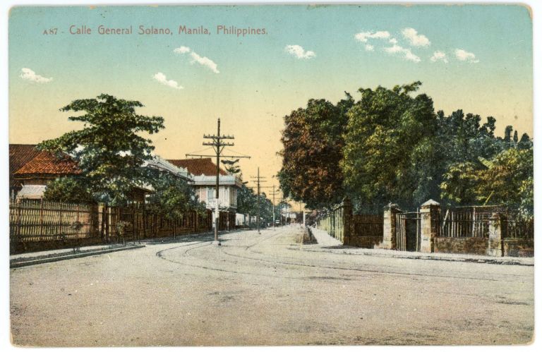 Empty General Solamo Street in San Miguel, Manila with streetcar tracks, power poles, and large gated homes.