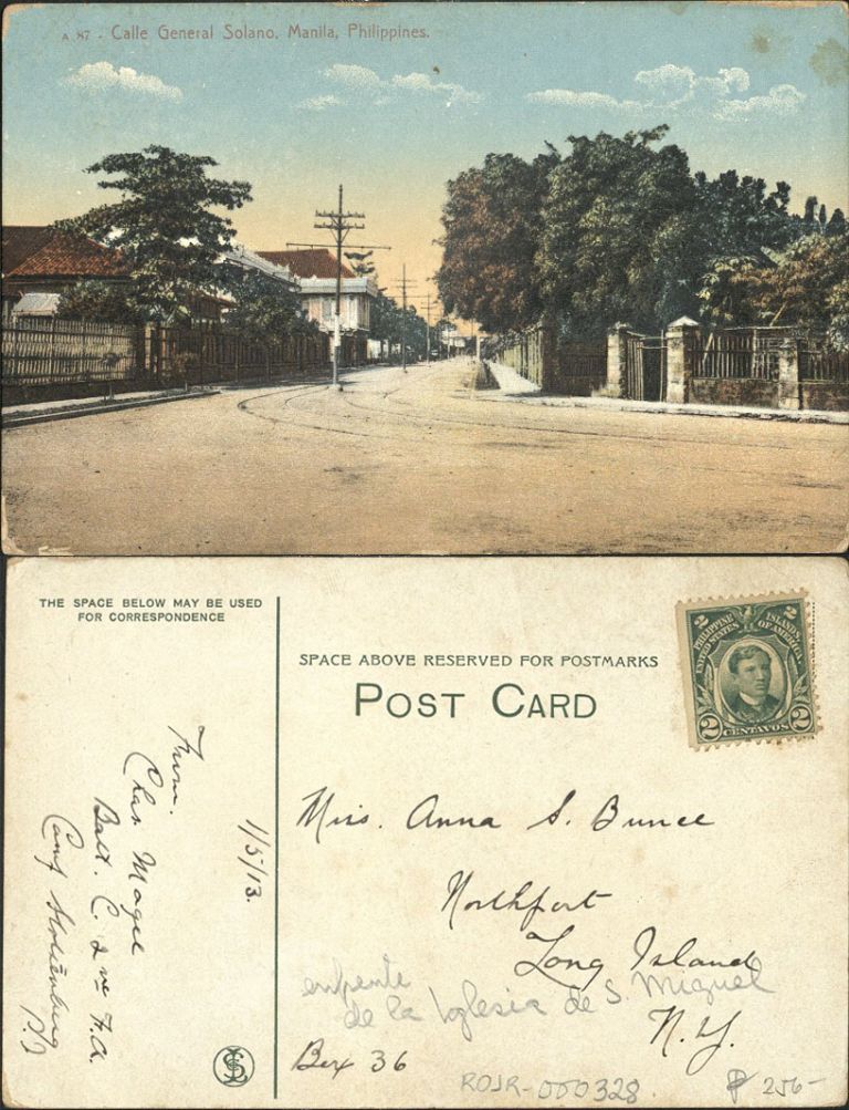Subject: Empty General Solamo Street in San Miguel, Manila with streetcar tracks, power poles, and large gated homes. See also OFI-006272 for a very similar real photo of this same view.