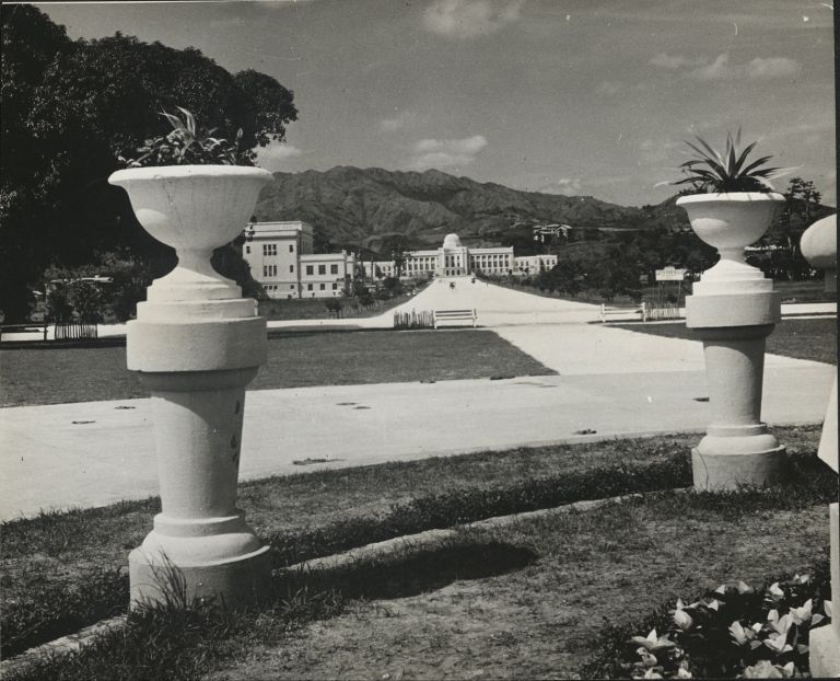 Subject: View from the Osmena Fountain down Dalan Osmena to the Cebu Provincial Capitol building and public library, built in 1938. During WWII the buildings were utilized as headquarters by the Japan