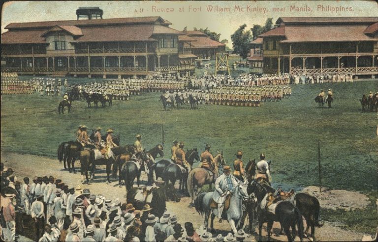 Subject: Soldiers in review formation, buildings to rear, spectators in front at Fort William McKinley (later Fort Bonifacio).