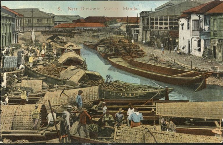 Subject: Boats on water laden with goods near Divisorio in Tondo District, Manila.