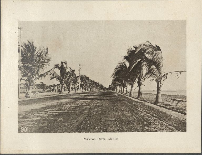 Subject: Long, straight Malecon (now Bonifacio) Drive in Manila, palm and shade trees both sides. Manila Bay is visible on far right. Givens was the post photographer at