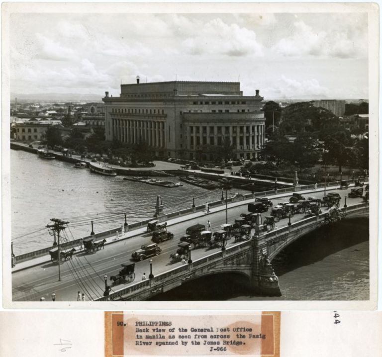 90. PHILIPPINES: Back view of the General Post Office in Manila as seen from across the Pasig River spanned by the Jones Bridge. J-966.