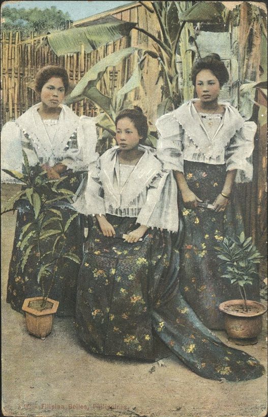 Subject: Three attractive young Filipinas in traditional dress pose outdoors around potted plants.