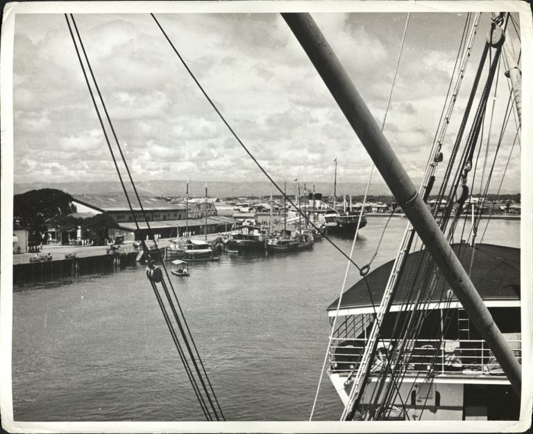 Subject: View of Iloilo port and harbor from top of a cargo ship. Ililo is a major shipping point for the sugar trade.