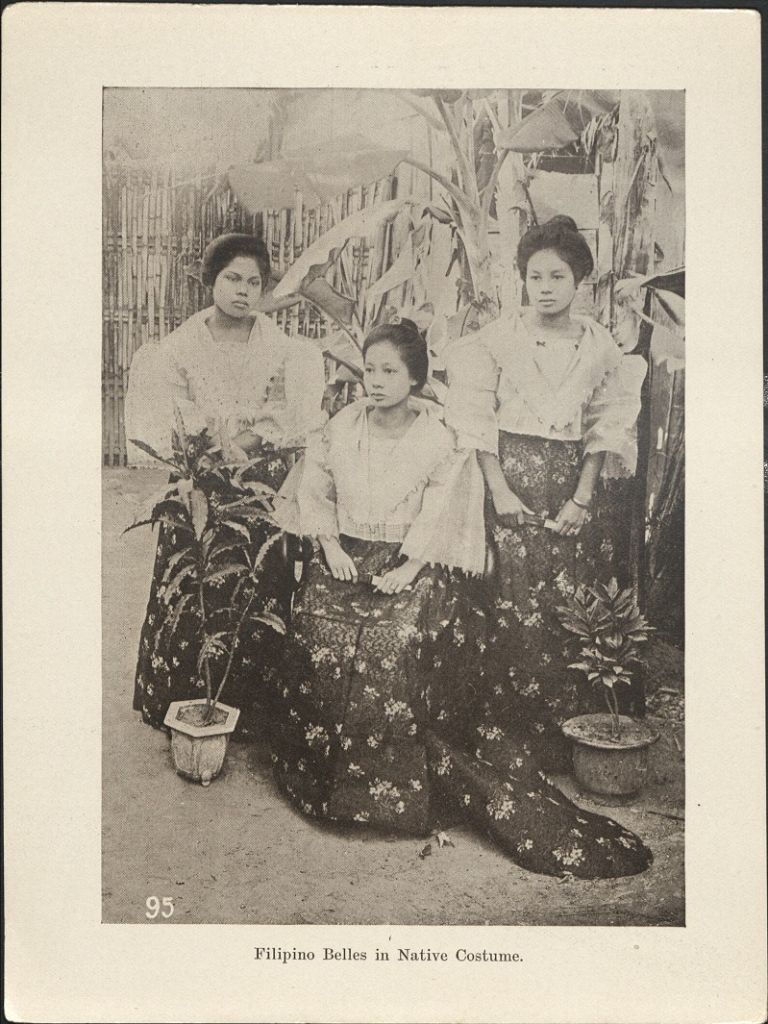 Subject: Three attractive young Filipinas in traditional dress pose outdoors around potted plants. See also ROJR-001471 for the same image as a colored postcard. Same image also as OFI-003