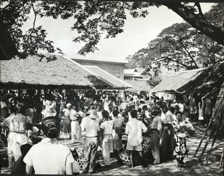 Subject: Busy market scene at San Nicolas in Cebu City with buyers and sellers mingling under large shade trees. Full caption reads: "San Nicolas open market at Cebu. Notice the bamboo straw roofs ove