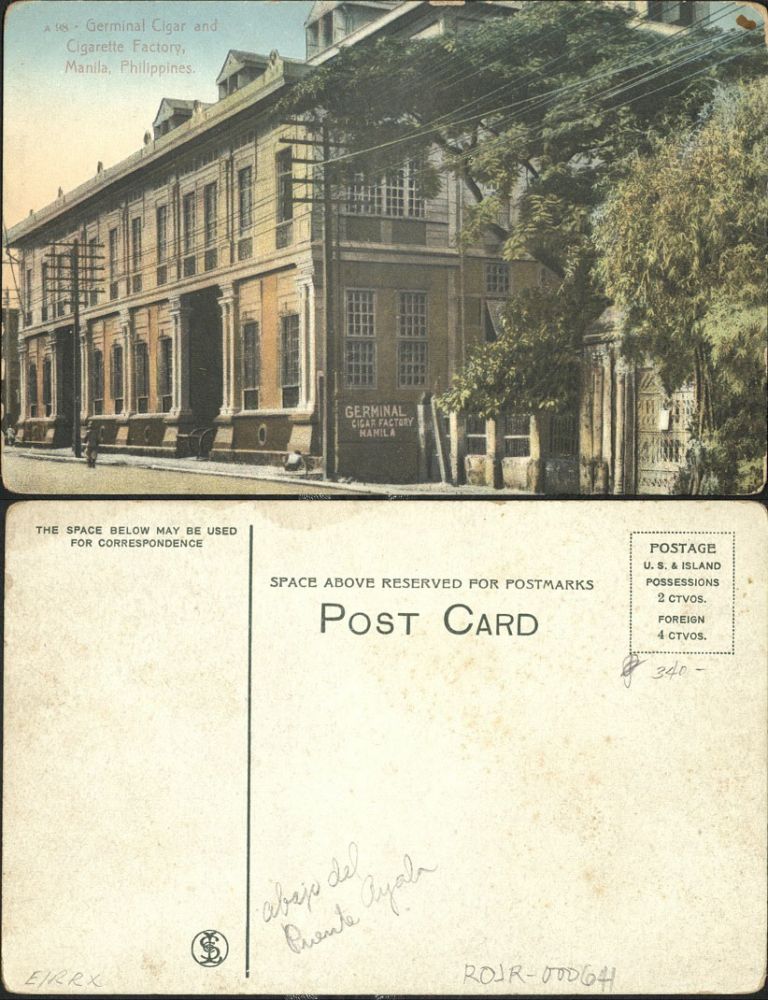 Subject: The Germinal Cigar Factory once stood at Calle Marques de Comillas in San Miguel, Manila, next to the Ayala Bridge. The factory produced up to 3 million cigarettes and 200,000 cigars a day.