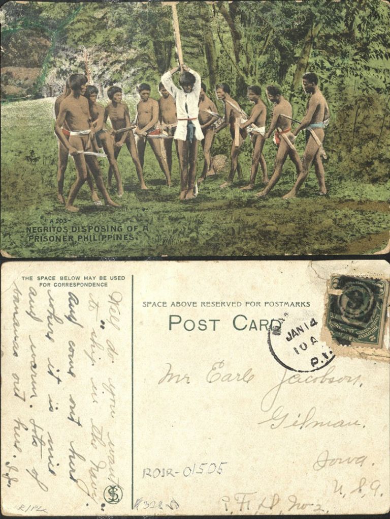Subject: Man tied to tall pole threatened by long knives. The Aeta are an indigenous people who live in scattered, isolated mountainous parts of Luzon. The Aeta were termed "Negrito" during the Sp