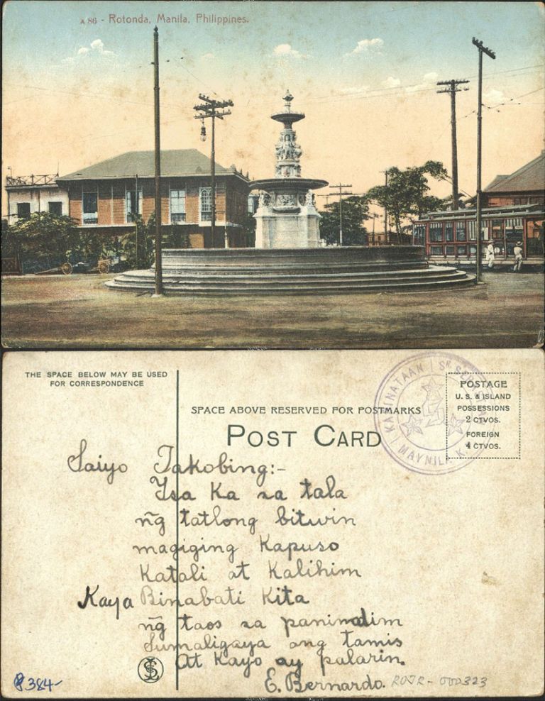 Subject: Traffic circle or roundabout with Carrieda Fountain in center and power poles, streetcar on right. Carrieda Fountain was first located at the intersection of Legarda, Lacson and Magsaysay str