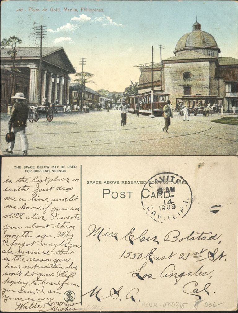 Subject: Passengers waiting at streetcar stop at Plaza Goiti [now Plaza Lacson] with Santa Cruz Church, Monte de Piedad Building,