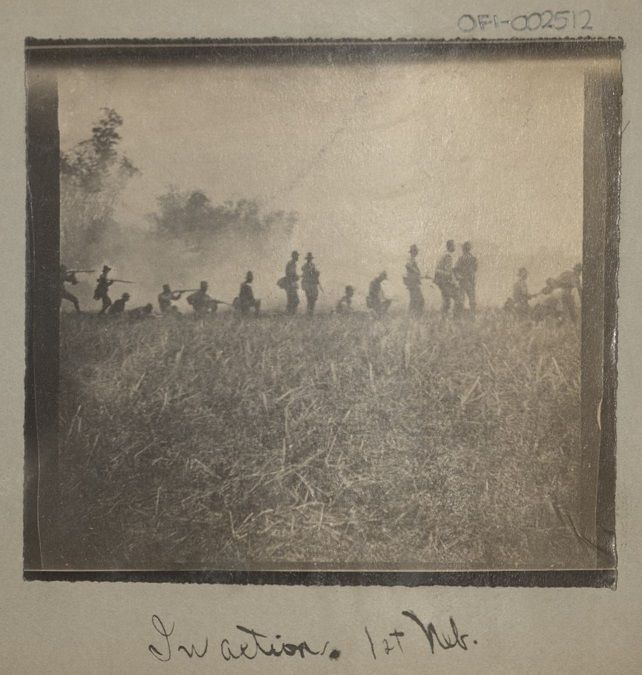 Subject: U.S. soldiers of the 1st Nebraska Infantry Regiment, fire their rifles while standing and kneeling in line on a battlefield. Lieut. Munson M. Z. Guthrie was an officer in Company A, 1st Sou