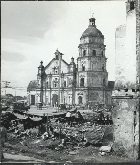 Activity in the Philippine capital goes on among the bombed ruins of the wrecked city [Binondo Church].