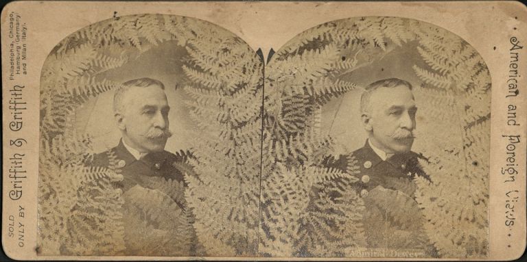 Griffith [unknown coding]. Formal portrait of Admiral Dewey, U.S. naval commander during the Battle of Manila Bay, with fern border.