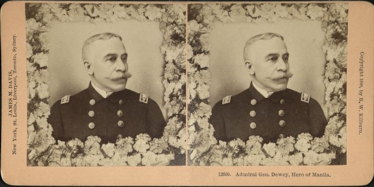 Kilburn #B12600. Formal portrait of Admiral Dewey, U.S. naval commander during the Battle of Manila Bay, with floral border.