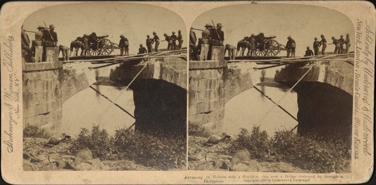 Underwoood #U1180II. Group of U.S. soldiers push a cannon over boards laid across partially-destroyed bridge near Malolos, Philippines.