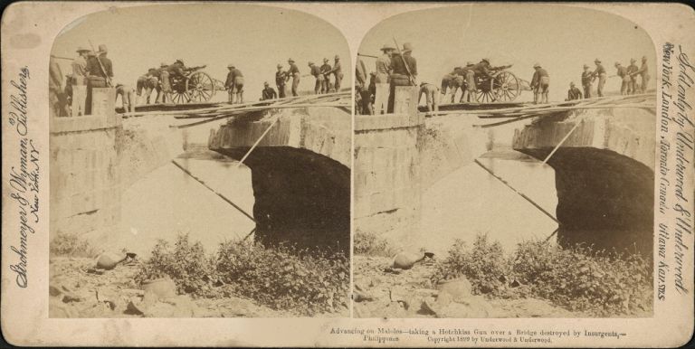 Advancing on Malolos - taking a Hotchkiss Gun over a Bridge destroyed by Insurgents, Philippines.