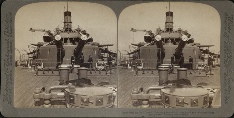 Underwood [unknown coding]. View on aft deck looking at 13-inch guns on the battleship "Oregon."
