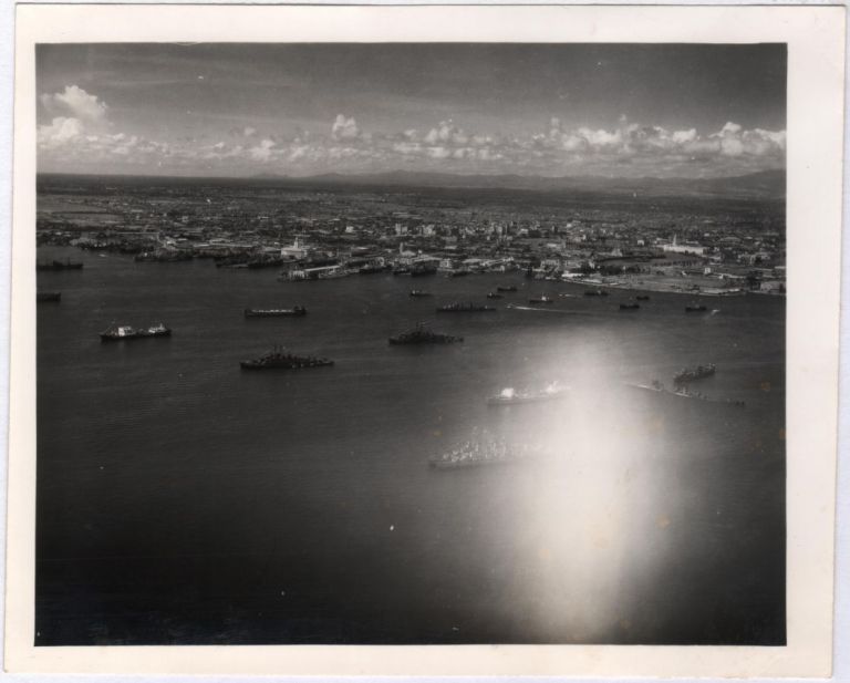 Aerial view of Manila from a position above Manila Bay looking east toward The Port District and Ermita. There are plenty of warships and cargo ships anchored, and a sunken Japanese ship.