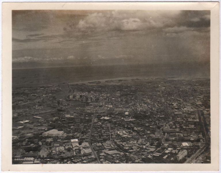 Aerial view of Manila from a position above Quiapo or San Miguel looking west at Binondo and Manila Bay. The Pasig River cuts through the view, and Intramuros is seen right center. Images in this album are from an American soldier in the U.S. Army 13th Air Force stationed at Clark Field.